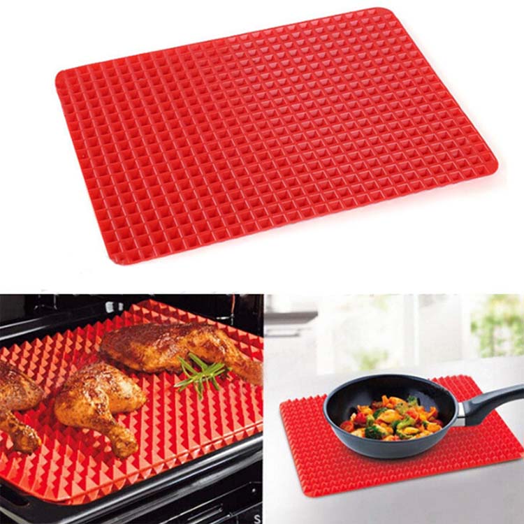 Mit unserer 3D Backplatte ersparst Du dir viel Arbeit, dank des Pyramidenförmigen Designs der Matte erreicht die Hitze gleichmäßig deine Backwaren. Die 3D Backmatte eignet sich für alle Backwaren, ob nun Geflügel, Fleisch, Fisch, Pommes oder Ofenkartoffel und verhindert dabei das die Nahrungsmittel im eigenen Fett liegen.
